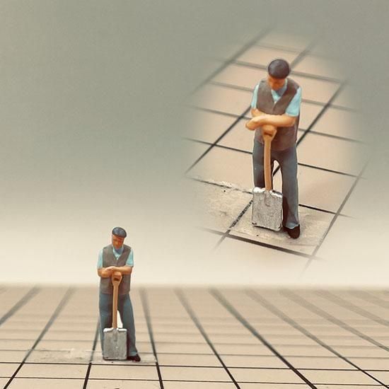 シャベルを片手に土を掘るヒト